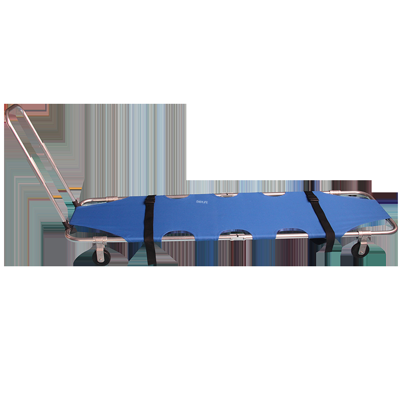This stretcher, with its frame mainly made of high-strength aluminum alloy (featuring light weight, small size, easy portability and safe use), has a blue Oxford leather surface for patients to lie on more comfortably. It has two braked right-angle wheels at one end, two angled wheels at the other, and a railing at the head, allowing one person to transfer patients effortlessly. Its support legs and casters fold for storage, and it comes with two safety straps to ensure patient safety during transport. Suitable for hospitals, clinics, ambulances, etc., it offers customization of size, fabric and color (common blue), an optional carrying bag, and serves to transport the sick and wounded or for emergencies.